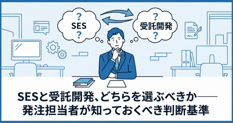 本記事では、クライアント企業の発注担当者に向けて、SESと受託開発の本質的な違い、SESのメリット・デメリット、失敗しないSES企業の選び方、そして受託開発を検討すべきケースについて解説します。